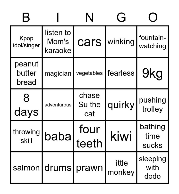 This bingo card has 25 words: baba, prawn, vegetables, salmon, fountain-watching, Kpop idol/singer, peanut butter bread, listen to Mom's karaoke, quirky, four teeth, fearless, 8 days, kiwi, bathing time sucks, magician, sleeping with dodo, pushing trolley, cars, 9kg, adventurous, chase Su the cat, drums, throwing skill, winking and little monkey.