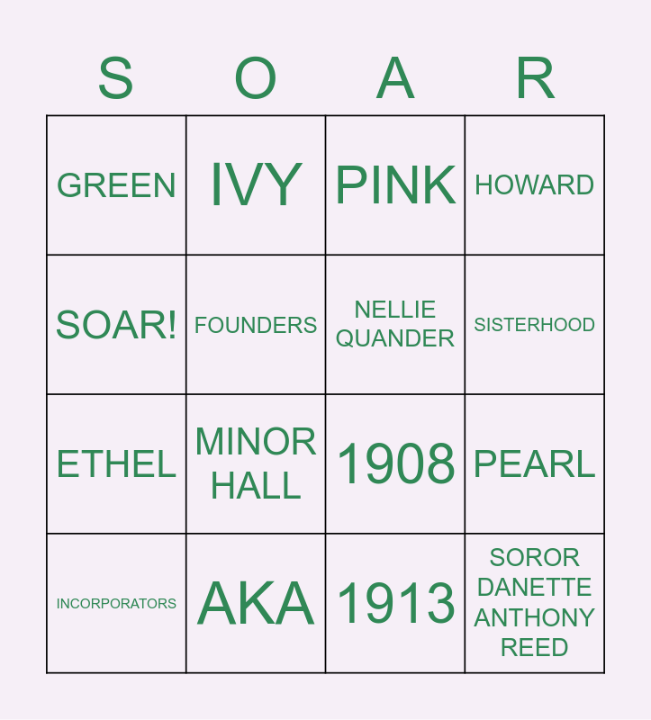 This bingo card has 16 words: AKA, PEARL, PINK, GREEN, ETHEL, IVY, 1908, 1913, SOAR!, FOUNDERS, INCORPORATORS, HOWARD, MINOR HALL, SISTERHOOD, NELLIE QUANDER and SOROR DANETTE ANTHONY REED.