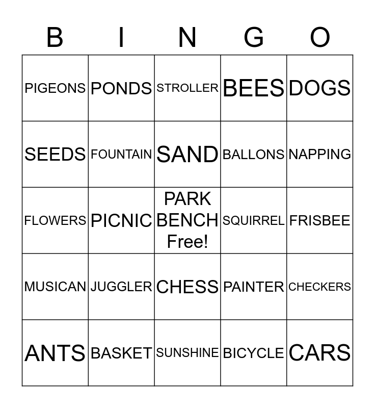 This bingo card has a free space and 24 words: JUGGLER, BASKET, SAND, ANTS, DOGS, PIGEONS, SEEDS, PONDS, SQUIRREL, CHESS, BALLONS, FLOWERS, PAINTER, CHECKERS, FOUNTAIN, BICYCLE, FRISBEE, STROLLER, NAPPING, PICNIC, CARS, MUSICAN, BEES and SUNSHINE.