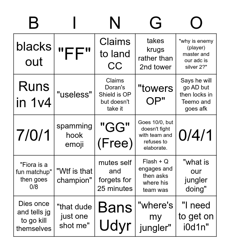 This bingo card has a free space and 24 words: Dies once and tells jg to go kill themselves, "Wtf is that champion", Claims Doran's Shield is OP but doesn't take it, "where's my jungler", "why is enemy (player) master and our adc is silver 2?", blacks out, "FF", Claims to land CC, Goes 10/0, but doesn't fight with team and refuses to elaborate., 0/4/1, 7/0/1, "useless", Flash + Q engages and then asks where his team was, "what is our jungler doing", Runs in 1v4, "that dude just one shot me", Bans Udyr, takes krugs rather than 2nd tower, Says he will go AD but then locks in Teemo and goes afk, "Fiora is a fun matchup" then goes 0/8, spamming hook emoji, mutes self and forgets for 25 minutes, "towers OP" and "I need to get on i0d1n".
