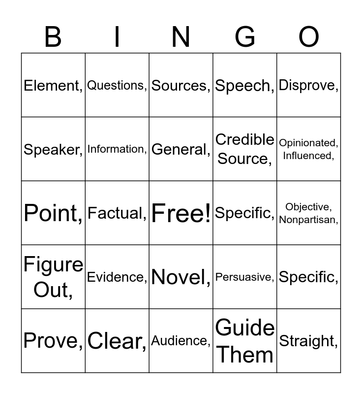 This bingo card has a free space and 25 words: Evidence,, Audience,, General,, Prove,, Disprove,, Element,, Speaker,, Questions,, Specific,, Novel,, Credible Source,, Point,, Persuasive,, Specific,, Information,, Pointless,, Objective, Nonpartisan,, Sources,, Opinionated, Influenced,, Factual,, Straight,, Clear,, Figure Out,, Speech, and Guide Them.