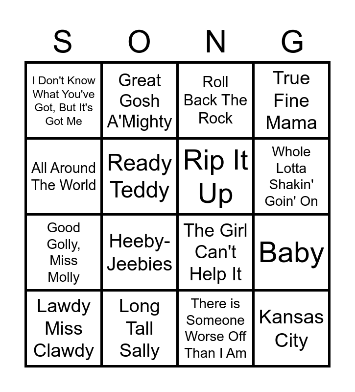 This bingo card has 27 words: Free!, Tutti Frutti, Good Golly, Miss Molly, Slippin' and Slidin', Ready Teddy, Roll Back The Rock, Great Gosh A'Mighty, Kansas City, Long Tall Sally, Lucille, The Girl Can't Help It, True Fine Mama, Ohh! My Soul, Bama Lama, Bama Loo, Heeby-Jeebies, Send Me Some Lovin', Rip It Up, Whole Lotta Shakin' Goin' On, She's Got It, I Don't Know What You've Got, But It's Got Me, There is Someone Worse Off Than I Am, Baby Face, Baby, Lawdy Miss Clawdy, Keep A Knockin', All Around The World and By The Light Of The World.
