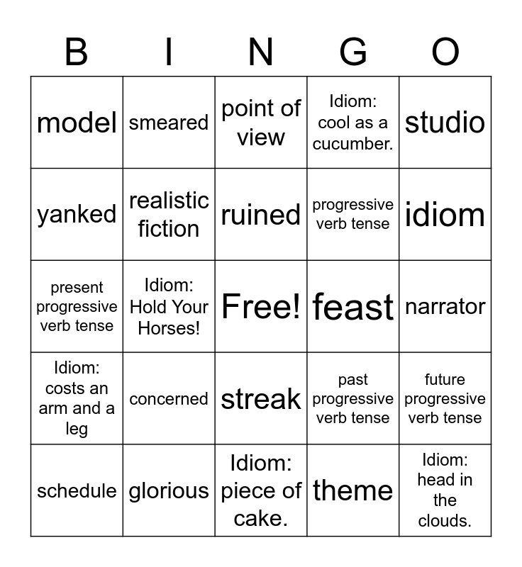 This bingo card has a free space and 24 words: concerned, glorious, ruined, schedule, studio, model, yanked, smeared, feast, streak, progressive verb tense, present progressive verb tense, past progressive verb tense, future progressive verb tense, realistic fiction, theme, narrator, point of view, idiom, Idiom: Hold Your Horses!, Idiom: head in the clouds., Idiom: costs an arm and a leg, Idiom: cool as a cucumber. and Idiom: piece of cake..