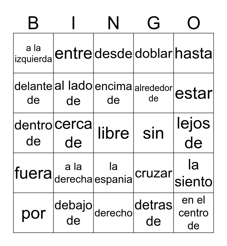 This bingo card has a free space and 24 words: a la derecha, debajo de, encima de, por, hasta, a la izquierda, delante de, entre, sin, la espania, alrededor de, dentro de, cruzar, la siento, al lado de, detras de, lejos de, desde, estar, cerca de, en el centro de, fuera, doblar and derecho.