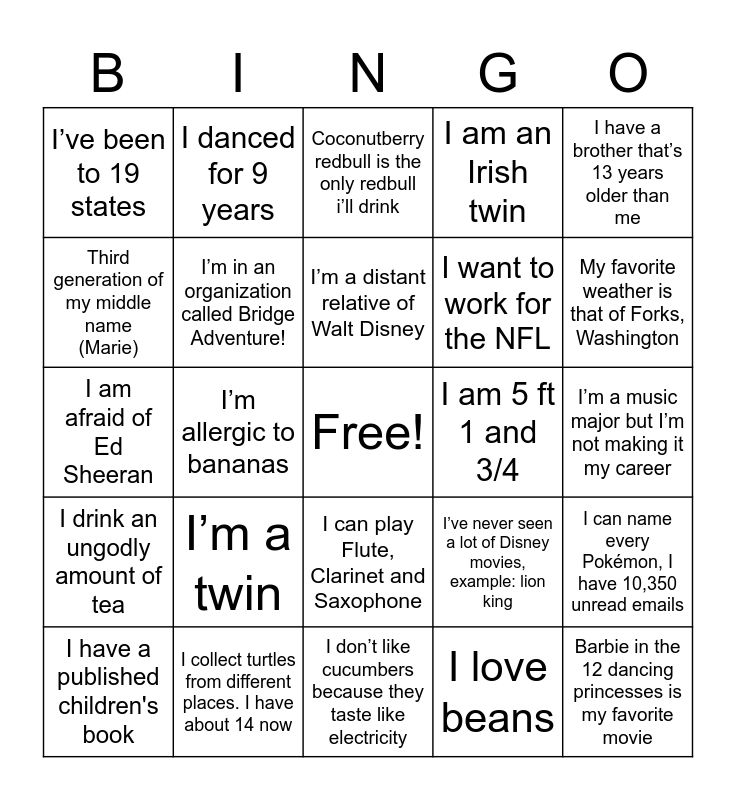 This bingo card has a free space and 37 words: I have double jointed elbows, i’m attempting to learn russian, I collect CDs, I’m in an organization called Bridge Adventure!, I can name every Pokémon, I have 10,350 unread emails, I’m a twin, I’m a distant relative of Walt Disney, I am a black belt in karate, I have a brother that’s 13 years older than me, i wanna be in the FBI, I’m allergic to bananas, I am an Irish twin, Barbie in the 12 dancing princesses is my favorite movie, I’m a music major but I’m not making it my career, Third generation of my middle name (Marie), I drink an ungodly amount of tea, i wanna be a spy, Coconutberry redbull is the only redbull i’ll drink, I can play Flute, Clarinet and Saxophone, I am 5 ft 1 and 3/4, I’ve been to 19 states, My favorite weather is that of Forks, Washington, I have a published children's book, I don’t like cucumbers because they taste like electricity, I became an aunt at 8 years old, Nearly lost my pointer finger, I love beans, I danced for 9 years, i can sing, I am the game master for a dungeons and dragons group, I won my elementary school spelling bee, I love to read, I collect turtles from different places. I have about 14 now, I am afraid of Ed Sheeran, As a kid I put cherry tomatoes in my cheerios with milk, I’ve never seen a lot of Disney movies, example: lion king, I want to work for the NFL and I know how to play 11 instruments..