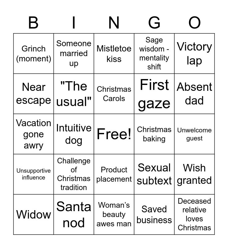 This bingo card has a free space and 62 words: Urban rural divide, Santa nod, Critical misunderstanding, Unsupportive influence, Serendipitous snowfall, Immediate connection, "The usual", A dance, First gaze, Guardian angel, Sage wisdom - mentality shift, Christmas tree shopping, Near escape, Inaccurate musician, School event, Grinch (moment), Deceased relative loves Christmas, Victory lap, Love triangle, Christmas Carols, Christmas baking, Mistletoe kiss, Widow, Saved business, Cougar Christmas, Small Christmas town, Living outside their means, Christmas charity, Wish granted, A vision, A Christmas Carol, Blended family, A bad guy, Snowstorm, Unwelcome guest, Someone married up, Tokenism, Homosexual subtext, Intuitive dog, Train moment, Vacation gone awry, Special ornaments, Challenge of Christmas tradition, Secret admirer, Absent dad, Sexual subtext, Church(y), “The end”, It was all a dream, Flashback/forward, Product placement, Woman’s beauty awes man, Character vanishes, Obstinate character reversal, Office Christmas party, Reindeer, “Naughty or Nice”, Matching Christmas Outfits, Wrapping presents, Decorating a tree, Transportation delay and Aseasonal Christmas.