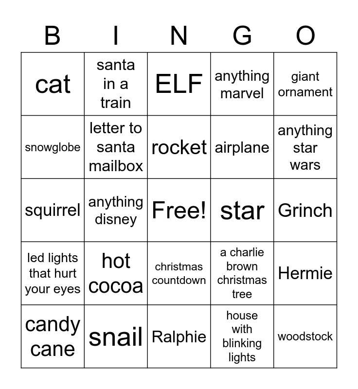 This bingo card has a free space and 24 words: hot cocoa, snail, rocket, candy cane, giant ornament, cat, snowglobe, santa in a train, star, christmas countdown, airplane, squirrel, a charlie brown christmas tree, Hermie, letter to santa mailbox, house with blinking lights, Grinch, ELF, anything star wars, anything disney, woodstock, led lights that hurt your eyes, anything marvel and Ralphie.