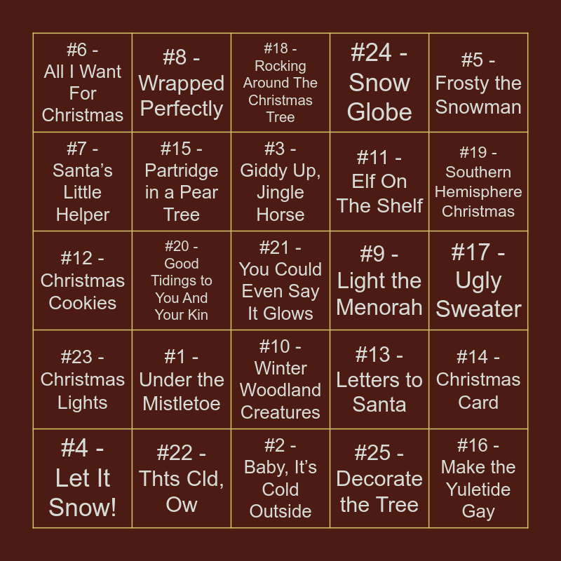 This bingo card has 25 words: #1 - Under the Mistletoe, #2 - Baby, It’s Cold Outside, #3 - Giddy Up, Jingle Horse, #4 - Let It Snow!, #5 - Frosty the Snowman, #6 - All I Want For Christmas, #7 - Santa’s Little Helper, #8 - Wrapped Perfectly, #9 - Light the Menorah, #10 - Winter Woodland Creatures, #11 - Elf On The Shelf, #12 - Christmas Cookies, #13 - Letters to Santa, #14 - Christmas Card, #15 - Partridge in a Pear Tree, #16 - Make the Yuletide Gay, #17 - Ugly Sweater, #18 - Rocking Around The Christmas Tree, #19 - Southern Hemisphere Christmas, #20 - Good Tidings to You And Your Kin, #21 - You Could Even Say It Glows, #22 - Thts Cld, Ow, #23 - Christmas Lights, #24 - Snow Globe and #25 - Decorate the Tree.