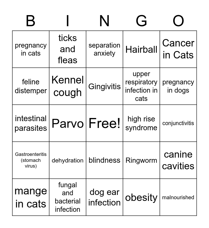 This bingo card has a free space and 36 words: Rabies, Heartworm, Bordetella, Kennel cough, Ringworm, Gastroenteritis (stomach virus), Gingivitis, FIV, Cancer in Cats, Cancer in Dogs, Parvo, Hairball, Lyme disease in dogs, high rise syndrome, pregnancy in dogs, pregnancy in cats, seizures, dehydration, malnourished, separation anxiety, conjunctivitis, canine cavities, fungal and bacterial infection, mange in cats, dog ear infection, ticks and fleas, intestinal parasites, feline diabetes, upper respiratory infection in cats, feline distemper, chronic kidney disease (CKD) in cats, canine hepatitis, obesity, blindness, deafness and poison ivy.