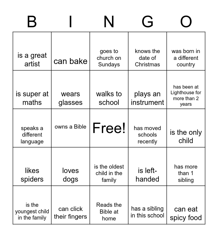 This bingo card has a free space and 24 words: loves dogs, can click their fingers, walks to school, is the youngest child in the family, was born in a different country, is a great artist, is super at maths, can bake, has moved schools recently, is the oldest child in the family, plays an instrument, speaks a different language, is left-handed, has more than 1 sibling, wears glasses, has a sibling in this school, is the only child, goes to church on Sundays, has been at Lighthouse for more than 2 years, owns a Bible, can eat spicy food, likes spiders, knows the date of Christmas and Reads the Bible at home.