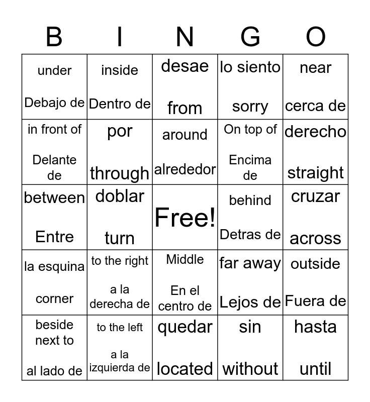 This bingo card has a free space and 24 words: to the right a la derecha de, to the left a la izquierda de, around alrededor, beside next to al lado de, near cerca de, under Debajo de, in front of Delante de, inside Dentro de, behind Detras de, Middle En el centro de, On top of Encima de, between Entre, far away Lejos de, outside Fuera de, por through, sin without, cruzar across, desae from, derecho straight, doblar turn, hasta until, la esquina corner, lo siento sorry and quedar located.