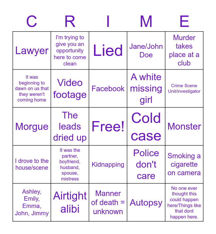 This bingo card has a free space and 29 words: Ashley, Emily, Emma, John, Jimmy, Record / parole violation / arrest record, The leads dried up, Florida, Lawyer, Lied, Video footage, It was the partner, boyfriend, husband, spouse, mistress, Cold case, Airtight alibi, Monster, No one ever thought this could happen here/Things like that dont happen here., Manner of death = unknown, Autopsy, Crime Scene Unit/investigator, Missing person flyers, Kidnapping, I drove to the house/scene, Murder takes place at a club, Morgue, Police don't care, Luminol, A white missing girl, It was beginning to dawn on us that they weren't coming home, Jane/John Doe, I'm trying to give you an opportunity here to come clean, Smoking a cigarette on camera, Facebook and October.