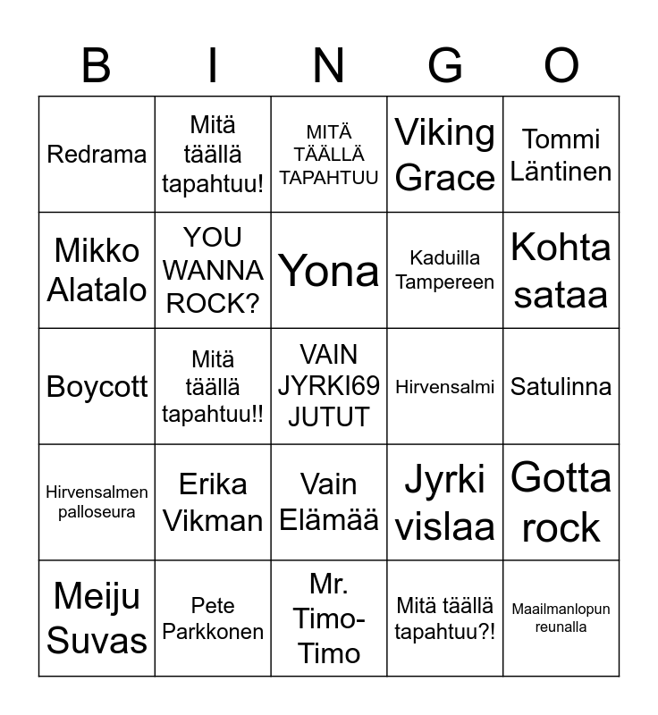 This bingo card has a free space and 24 words: Erika Vikman, Pete Parkkonen, Yona, Meiju Suvas, Tommi Läntinen, Redrama, Mikko Alatalo, Mitä täällä tapahtuu!, Hirvensalmi, Vain Elämää, Kaduilla Tampereen, Boycott, Jyrki vislaa, Gotta rock, YOU WANNA ROCK?, Mitä täällä tapahtuu?!, Satulinna, MITÄ TÄÄLLÄ TAPAHTUU, Kohta sataa, Mitä täällä tapahtuu!!, Maailmanlopun reunalla, Hirvensalmen palloseura, Viking Grace and Mr. Timo-Timo.