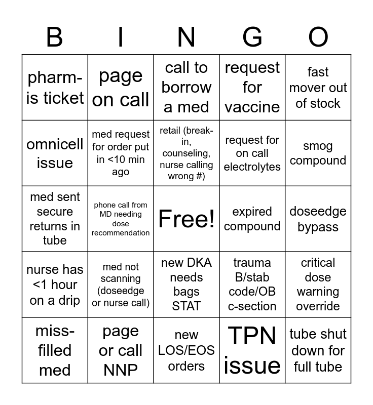 This bingo card has a free space and 34 words: compatibility question, TPN issue, alteplase, picu missing med, nurse has <1 hour on a drip, med request for order put in <10 min ago, fast mover out of stock, miss-filled med, page on call, request for med to be tubed on do not tube list, retail (break-in, counseling, nurse calling wrong #), call to borrow a med, med message requesting drug in omnicell, need new tackle box, expired compound, smog compound, page or call NNP, med sent secure returns in tube, med not scanning (doseedge or nurse call), trauma B/stab code/OB c-section, new DKA needs bags STAT, calling maintenance or environmental services, pharm-is ticket, doseedge bypass, new LOS/EOS orders, tube shut down for full tube, request for vaccine, recon med, request for on call electrolytes, omnicell issue, med message requesting med scanned into med bin, phone call from MD needing dose recommendation, critical dose warning override and need to waste narc.