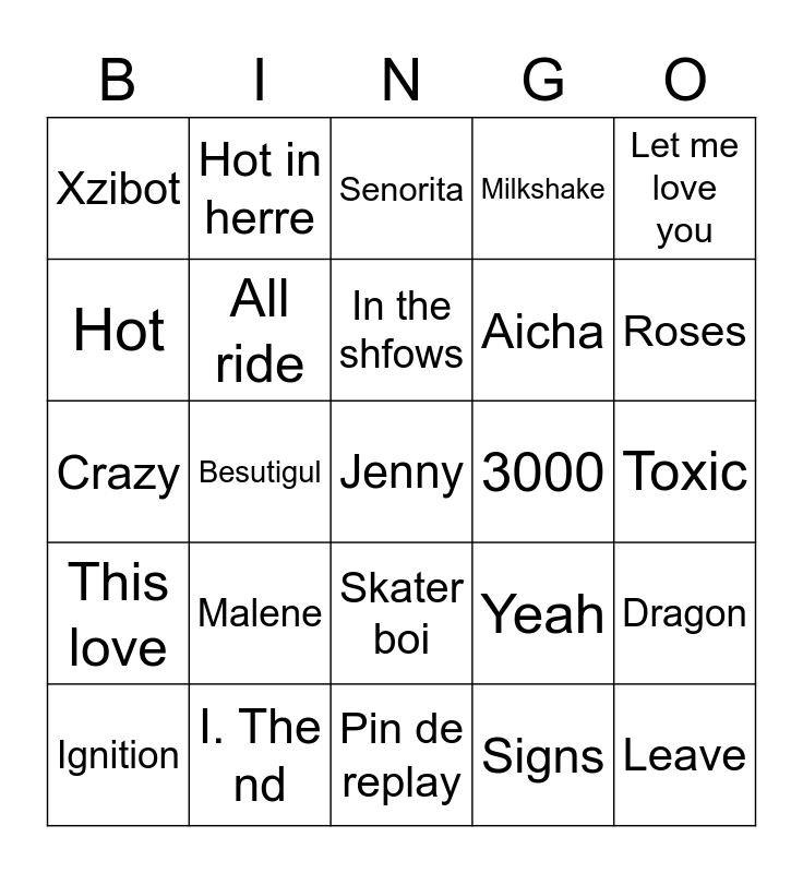 This bingo card has a free space and 24 words: Malene, I. The nd, In the shfows, Ignition, Let me love you, Xzibot, Hot, Hot in herre, 3000, Skater boi, Aicha, Crazy, Yeah, Dragon, All ride, Signs, Toxic, Senorita, Roses, Besutigul, Leave, This love, Milkshake and Pin de replay.