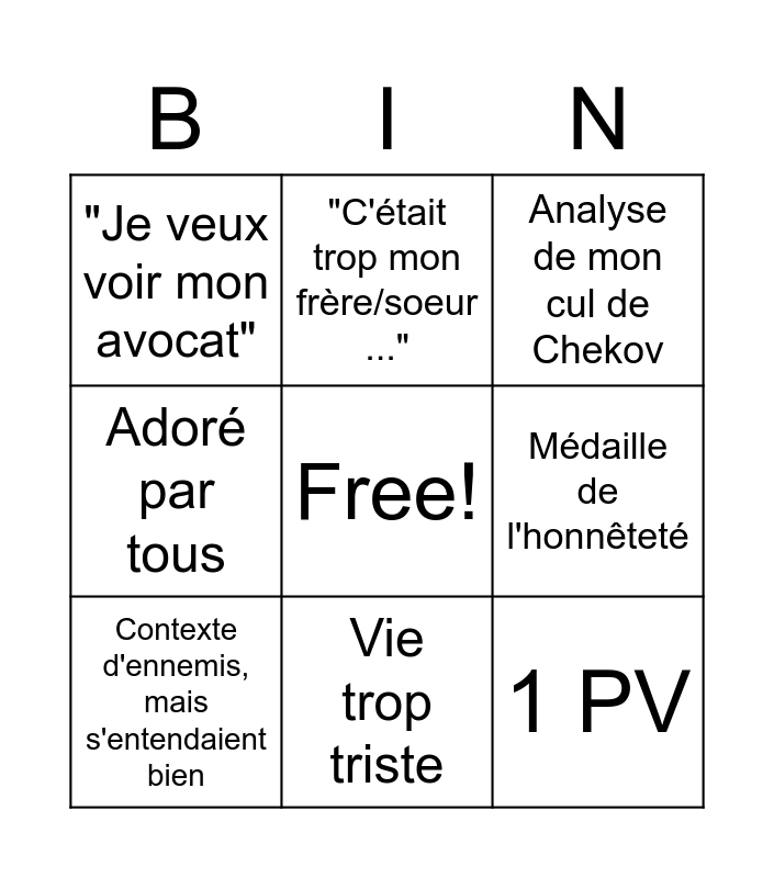 This bingo card has a free space and 14 words: Menace PILE comme il faut, Première menace juste, Contexte d'ennemis, mais s'entendaient bien, "C'était trop mon frère/soeur ...", Adoré par tous, 1 PV, "JE NE VOULAIS PAS LUI FAIRE DE MAL ! ", Lily assisté aux aveux, Vie trop triste, "Je veux voir mon avocat", Capitule et fait des aveux très vite, Médaille de l'honnêteté, Analyse de mon cul de Chekov and Tape 2 fois sur le carton.