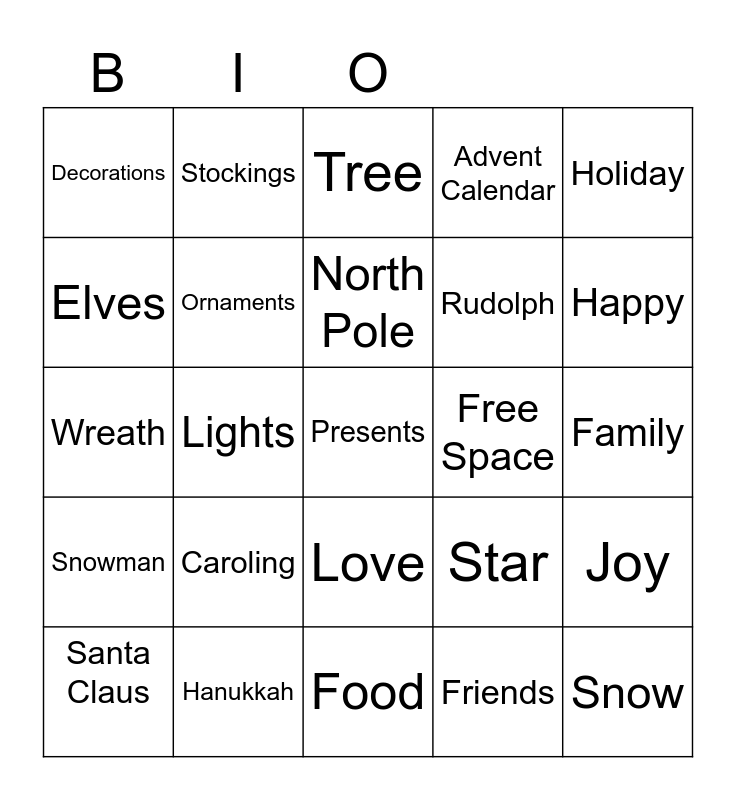 This bingo card has a free space and 29 words: Santa Claus, Advent Calendar, Lights, Movies, Decorations, Tree, Ornaments, Caroling, Free Space, Hanukkah, Family, Snow, Food, Friends, Happy, Reindeer, Love, Snowman, Holiday, Wreath, Star, Traditions, Rudolph, Elves, Advent Calendar, Stockings, Joy, North Pole and sleigh.