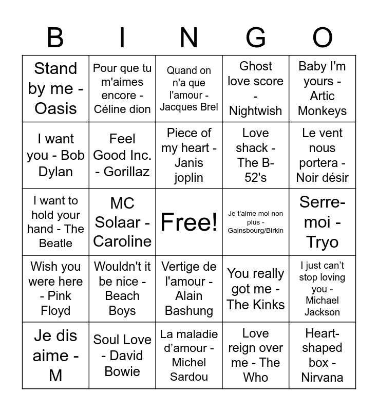 This bingo card has a free space and 60 words: Somebody to love - Queen, Soul Love - David Bowie, True love waits - Radiohead, Wish you were here - Pink Floyd, Love reign over me - The Who, I wanna melt with U - Prince, Feel Good Inc. - Gorillaz, Baby Please Don’t Go - ACDC, Love shack - The B-52's, Do you feel it? - Chaos Chaos, Ghost love score - Nightwish, Because the night - Patti Smith, I want you - Bob Dylan, Could you be loved - Bob Marley, Digital love - Daft punk, Stand by me - Oasis, Heart-shaped box - Nirvana, Baby I'm yours - Artic Monkeys, Dream on - Aerosmith, Piece of my heart - Janis joplin, Je t’aime moi non plus - Gainsbourg/Birkin, Quand on n'a que l'amour - Jacques Brel, Je dis aime - M, I just can’t stop loving you - Michael Jackson, Someone to love - Rita Mitsouko, Ce rêve bleu - Aladdin, More than love - Ben harper, Un Amor - Gyspy king, Le vent nous portera - Noir désir, Ain't no mountain high enough - Marvin Gaye/Terell, Mon amour - Stroame, Histoire d’amour - Gael faye, Laisse-moi t'aimer - Mike brant, Lay all your love on me - Abba, Pour que tu m'aimes encore - Céline dion, Ensemble - Orelsan, Vampire de l'amour - Dionysos, MC Solaar - Caroline, Un poco loco - Coco, I want to hold your hand - The Beatle, L'été indien - Joe Dassin, Wouldn't it be nice - Beach Boys, Serre-moi - Tryo, Dream a little dream of me - Ella Fitzgerald, You really got me - The Kinks, Every little thing she does is magic - The Police, L'amour à la plage - Niagara, Happy together - The Turtles, Can't get enough of your love baby - Barry White, Vertige de l'amour - Alain Bashung, La maladie d’amour - Michel Sardou, Les mots bleus - Christophe, Oh, pretty woman - Roy Orbison, Sensualité - Axelle Red, Eternal flame - The Bangles, Destinée - Guy Marchand, Fallin' - Alicia Keys, I put a spell on you - Nina Simone, L-O-V-E - Nat King Cole and Que Je T'aime - Johnny Hallyday.