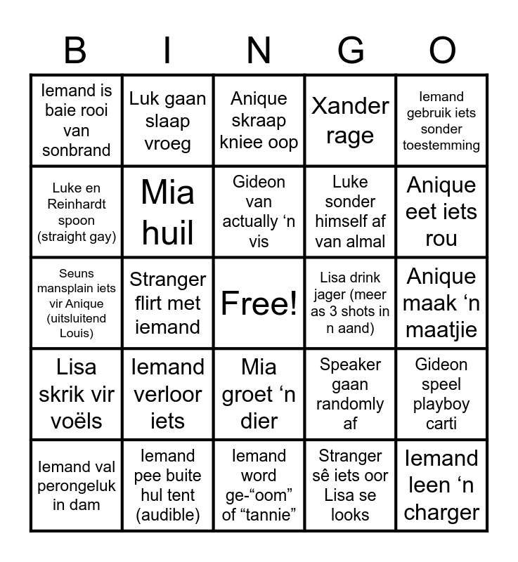 This bingo card has a free space and 30 words: Iemand pee buite hul tent (audible), Lisa gebruik first aid kit, Stranger flirt met iemand, Bord kos val, Iemand is baie rooi van sonbrand, Anique skraap kniee oop, Mia huil, Mia groet ‘n dier, Lisa drink jager (meer as 3 shots in n aand), Iemand word ge-“oom” of “tannie”, Anique maak ‘n maatjie, Iemand leen ‘n charger, Stranger sê iets oor Lisa se looks, Anique force iemand om te sokkie, Anique eet iets rou, Kos word gebrand, Speaker gaan randomly af, Lisa skrik vir voëls, Iemand verloor iets, Iemand gebruik iets sonder toestemming, Seuns mansplain iets vir Anique (uitsluitend Louis), Karl daag op, Luk gaan slaap vroeg, Luke sonder himself af van almal, Luke en Reinhardt spoon (straight gay), Xander rage, Gideon speel playboy carti, Iemand val perongeluk in dam, Gideon van actually ‘n vis and Gideon discuss sprite cranberry.