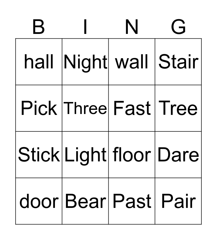 This bingo card has 16 words: Bear, Dare, wall, hall, Stick, Night, floor, Past, Pick, Three, door, Stair, Light, Tree, Fast and Pair.