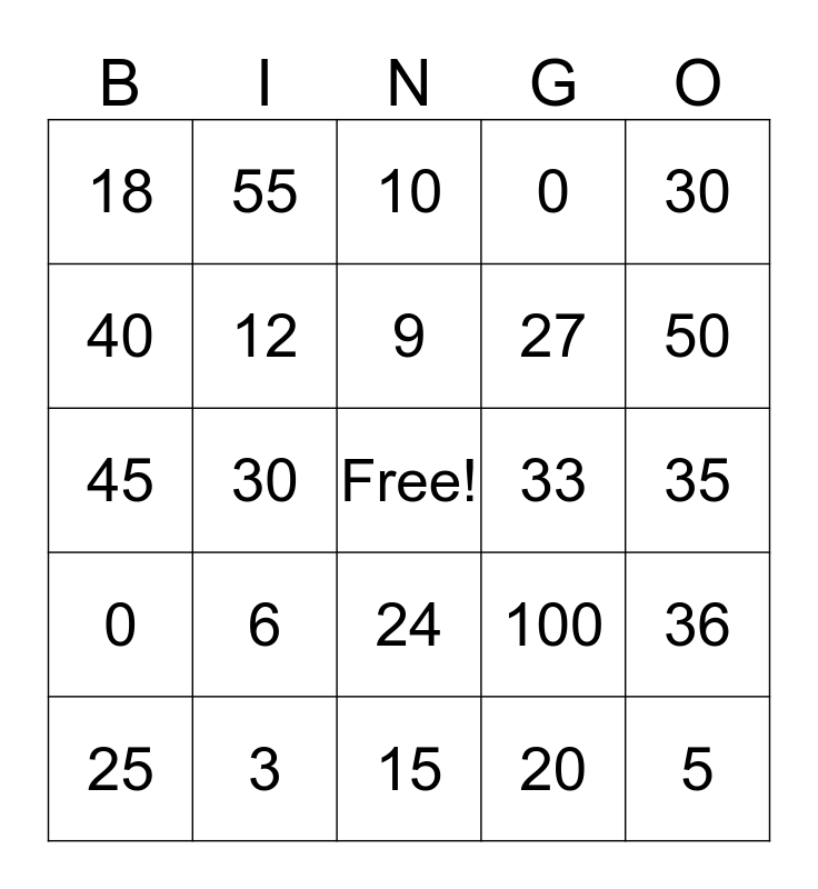 This bingo card has a free space and 25 words: 6, 15, 9, 25, 30, 18, 40, 55, 33, 24, 27, 45, 100, 36, 12, 21, 35, 10, 50, 30, 5, 3, 0, 0 and 20.