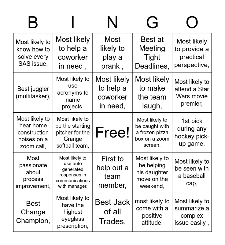 This bingo card has a free space and 87 words: Most likely to show up with a positive attitude,, Most likely to take an old process and make it better,, First to help out a team member,, Most likely to put himself in front of a hurricane,, Most Likely to stay calm in a crisis,, Most organized,, Most reliable in a pinch,, Most likely to be found at a Parrot Head concert,, Most likely to forget their food in the fridge.,, Most likely to be smiling regardless of circumstances :),, Most Likely to Generate Creative Ideas,, Most likely to improve a process,, Most likely to be seen with a baseball cap,, 1st pick during any hockey pick-up game,, Most likely to have an answer to technical questions,, Most likely to help a coworker in need,, Most likely to have an excellent restaurant recommendation,, Best team event planner,, Most likely to wear Mickey/Minnie ears to work,, Most likely to classify categorize and collaborate,, Most likely to have a fun background in Zoom meetings,, Most likely to go on an adventurous vacation,, Most likely to hear home construction noises on a zoom call,, Best background on zoom meetings,, most likely to come with a positive attitude,, Best source of off-the-beaten path recommendations for restaurants towns to visit and more,, Most likely to always think of policyholders first,, Most Likely to know every excel shortcut,, Most likely to take all PTO in ½ hour increments,, Most likely to bring a household member guest to a Zoom call,, Most likely to have the highest eyeglass prescription,, Most in need of drywall for their zoom background,, Most likely to incorporate a pop culture reference into a work topic,, Most likely to use auto generated responses in communications with manager,, Best juggler (multitasker),, Most inquisitive,, Most likely to attend a Star Wars movie premier,, Most excited about improving the acquisition staging and analytic utilization of data at Grange,, Best at meeting tight deadlines with high quality work,, Most likely to be the starting pitcher for the Grange softball team,, Most likely to receive a speeding ticket in a snowmobile,, Most likely to run a ½ marathon and beat us all! ,, Most likely catch a mistake ,, Most likely to be caught with a frozen pizza box on a zoom screen,, Most likely to ensure processes get documented,, Most likely to provide a practical perspective,, Most reliable and master of multitasking,, Most likely to help a coworker in need ,, Most likely to have a dog appear on a zoom call,, Most likely to build a new analysis from scratch ,, Most likely to increase the length of a zoom meeting,, Most likely to coordinate team celebrations,, Most passionate about process improvement,, Most likely to be drinking coffee or tea during a zoom call,, Most likely to share with their teammates when they discover something new,, Best go to for latest Bluejackets updates,, Most likely to make the team laugh,, Most likely working on your contract ,, Most likely to have his dogs bark on a Board Zoom call,, Best at Meeting Tight Deadlines,, Most likely to use acronyms to name projects,, Best Jack-of-all-trades ,, Most likely to respond to an email in 0.2 seconds ,, Most likely to come off mute and share comments,, Most likely to provide thoughtful feedback,, Most likely to have contractors in her house,, Most likely to never say no,, Best Change Champion,, Most likely to summarize a complex issue easily ,, Most likely to keep the meeting on topic and on time,, Most likely to know why things work the way they do,, Most likely to build something really good from scratch,, Most likely to play a prank ,, Most likely to be helping his daughter move on the weekend,, Most likely to be off video in meetings,, Most likely to share fantastic family photos / Best shutterbug / fun family photo- capturer,, Most likely to never buy an Apple product,, Best Jack of all Trades,, Most likely to use unfamiliar vocabulary / Best vocabulary,, Most extroverted on the team,, Most Likely to still include himself as part of his prior organization (today is Greg’s 3rd day at Grange),, Most likely to have thought through each detail of a solution,, Most likely to "tell it like it is",, Most likely to smuggle a criminal out of a foreign country,, Most versatile,, Most likely to know how to solve every SAS issue, and Most likely to clean up code.