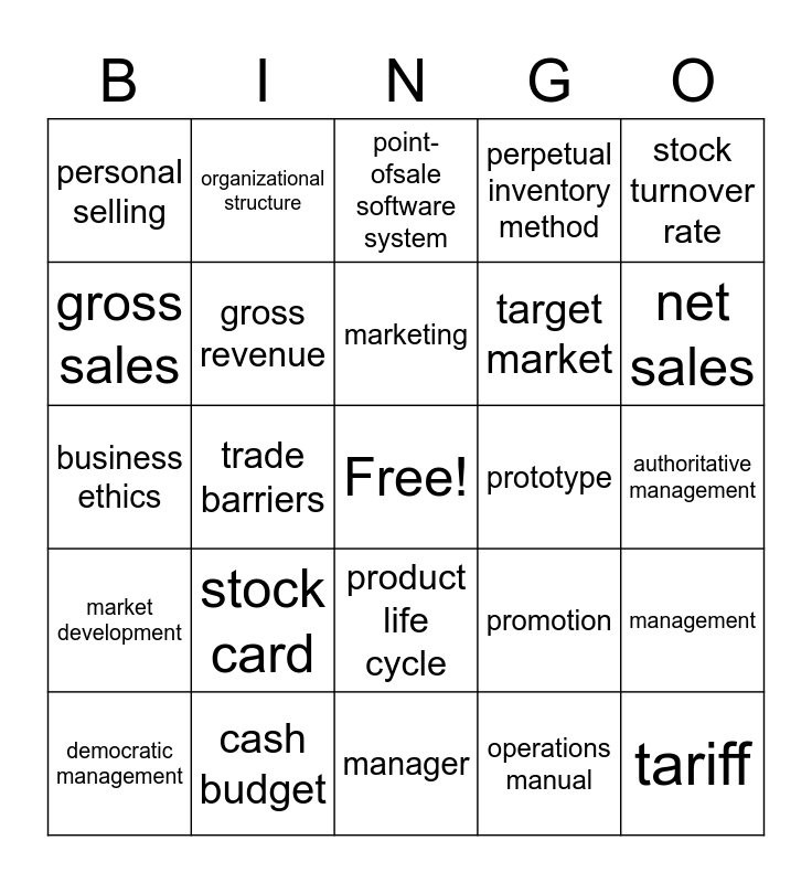 This bingo card has a free space and 24 words: stock card, cash budget, marketing, democratic management, stock turnover rate, personal selling, gross sales, organizational structure, prototype, product life cycle, target market, business ethics, promotion, management, gross revenue, operations manual, authoritative management, point-ofsale software system, net sales, trade barriers, tariff, market development, perpetual inventory method and manager.