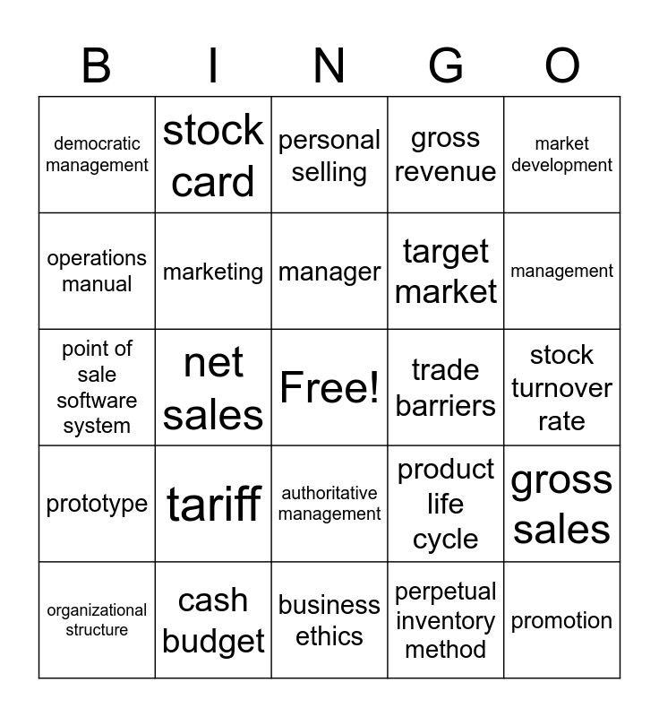 This bingo card has a free space and 24 words: tariff, cash budget, manager, organizational structure, market development, democratic management, operations manual, stock card, trade barriers, authoritative management, target market, point of sale software system, product life cycle, gross sales, marketing, perpetual inventory method, stock turnover rate, personal selling, management, net sales, promotion, prototype, gross revenue and business ethics.