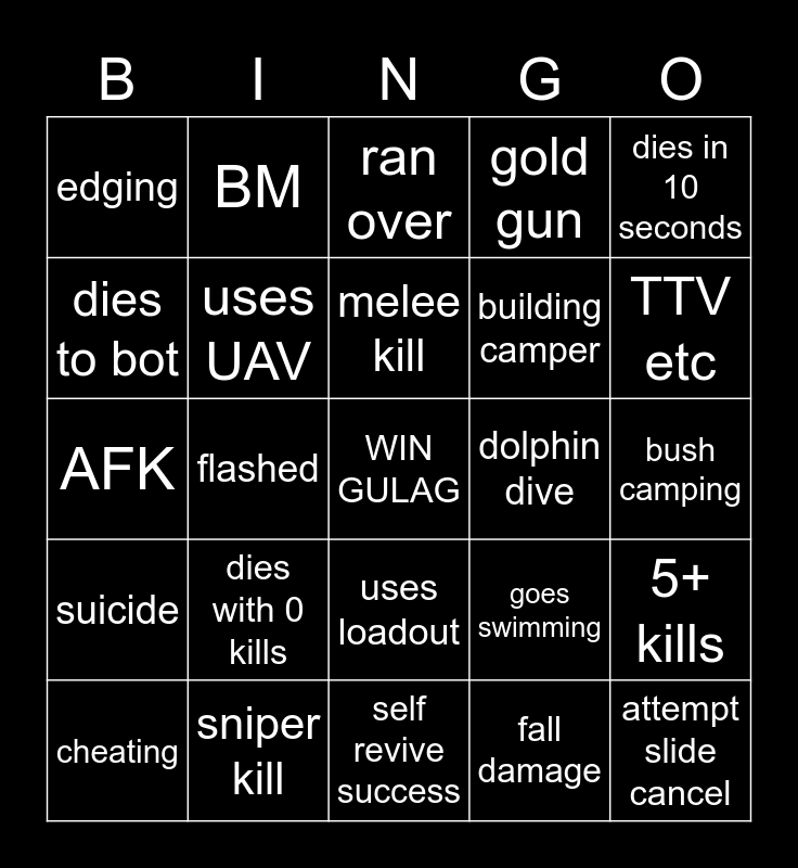This bingo card has a free space and 24 words: dies with 0 kills, sniper kill, melee kill, cheating, dies in 10 seconds, edging, dies to bot, BM, dolphin dive, uses loadout, building camper, AFK, goes swimming, 5+ kills, uses UAV, fall damage, bush camping, ran over, TTV etc, flashed, attempt slide cancel, suicide, gold gun and self revive success.