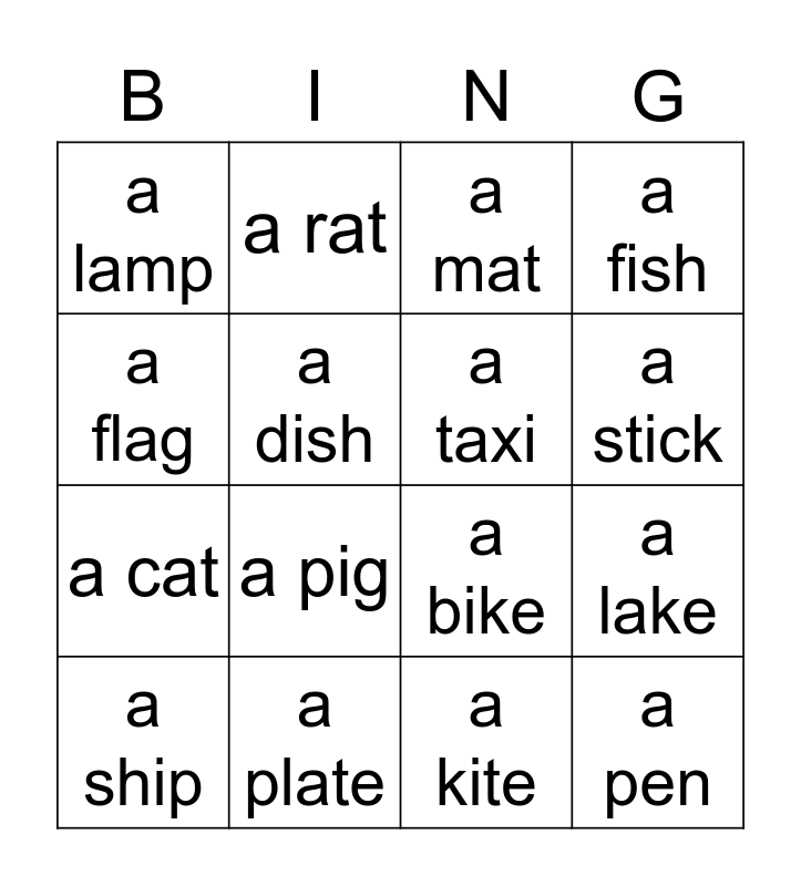 This bingo card has 16 words: a plate, a lake, a mat, a lamp, a cat, a rat, a bike, a kite, a flag, a dish, a ship, a fish, a pig, a stick, a taxi and a pen.