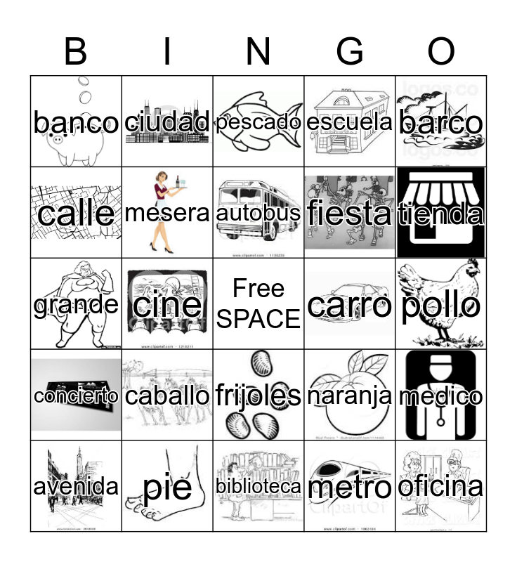 This bingo card has 24 images, a free space and 24 words: caballo, pie, autobus, avenida, barco, banco, calle, ciudad, carro, frijoles, fiesta, grande, naranja, medico, mesera, metro, pollo, pescado, tienda, cine, oficina, concierto, escuela and biblioteca.