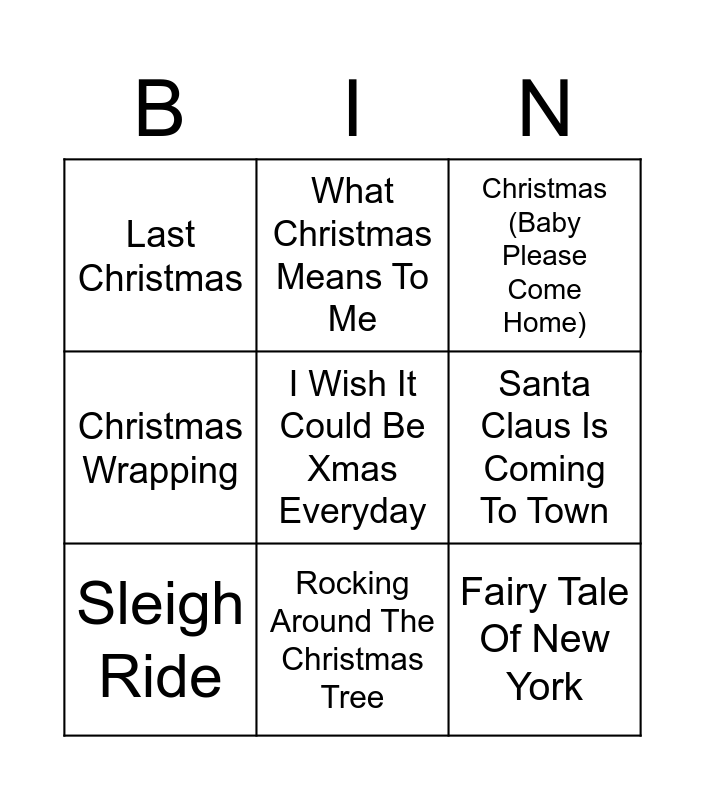 This bingo card has 9 words: Sleigh Ride, I Wish It Could Be Xmas Everyday, Christmas (Baby Please Come Home), Last Christmas, What Christmas Means To Me, Santa Claus Is Coming To Town, Christmas Wrapping, Rocking Around The Christmas Tree and Fairy Tale Of New York.