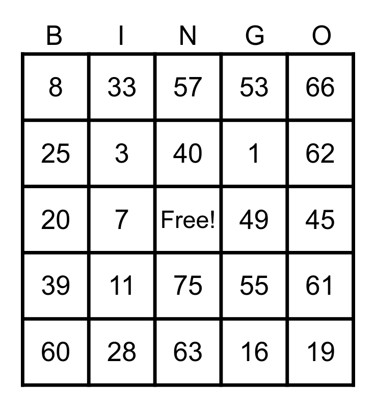 This bingo card has a free space and 24 words: 11, 28, 40, 60, 66, 8, 25, 33, 49, 75, 1, 20, 55, 61, 3, 16, 45, 57, 62, 7, 19, 39, 53 and 63.