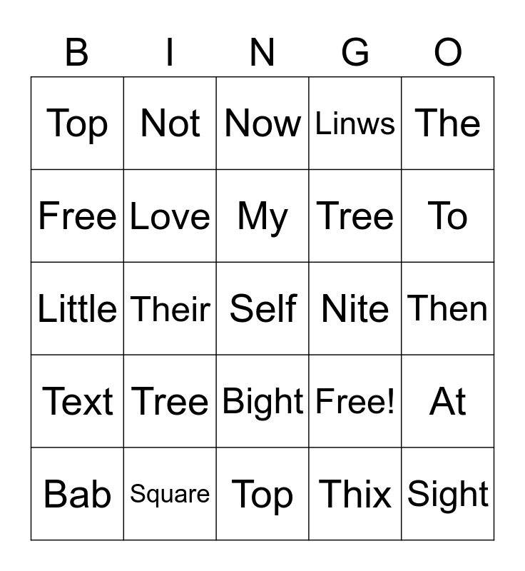 This bingo card has 25 words: Tree, Top, My, Bab, The, Top, Free, Not, Nite, Bight, Tree, Little, Free!, At, Love, Sight, Then, Now, To, Their, Self, Square, Text, Linws and Thix.