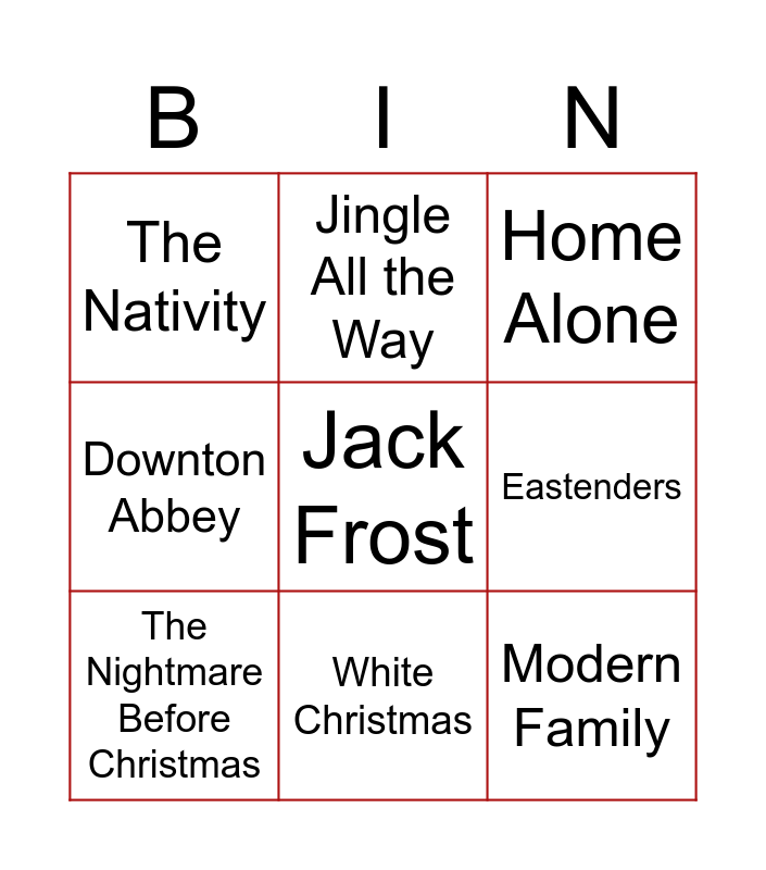 This bingo card has 30 words: Elf, Love Actually, Deck the Halls, Die Hard, The Nativity, Home Alone, The Nightmare Before Christmas, The Polar Express, The Holiday, The Office, It’s a Wonderful Life, How the Grinch Stole Christmas, Miracle on 34th Street, The Santa Clause, Gavin & Stacey, Christmas Vacation, Shrek the Halls, The Snowman, Arthur Christmas, Jack Frost, Klaus, Friends, Jingle All the Way, Modern Family, Eastenders, Downton Abbey, Christmas Carol, Gremlins, White Christmas and The Knight before Christmas.