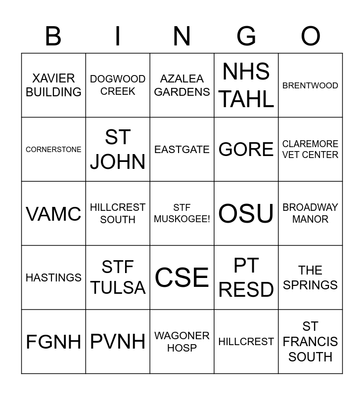 This bingo card has a free space and 24 words: STF TULSA, PVNH, EASTGATE, FGNH, BRENTWOOD, XAVIER BUILDING, CORNERSTONE, DOGWOOD CREEK, OSU, CSE, GORE, VAMC, PT RESD, THE SPRINGS, ST JOHN, HILLCREST, BROADWAY MANOR, AZALEA GARDENS, CLAREMORE VET CENTER, HILLCREST SOUTH, ST FRANCIS SOUTH, HASTINGS, NHS TAHL and WAGONER HOSP.