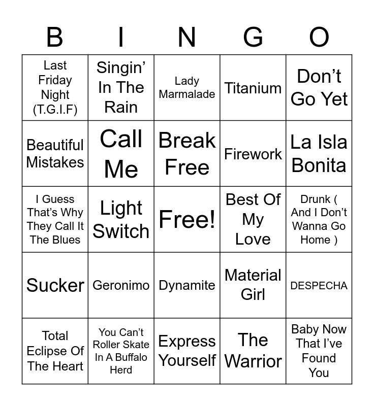 This bingo card has a free space and 63 words: You Make Me Feel So Young, Heroes, Fly Me To The Moon, DESPECHA, Anti-Hero, World’s Smallest Violin, Singin’ In The Rain, Late Night Talking, Break Free, Can’t Stop Us Now, Dynamite, I Gotta Feeling, Drunk ( And I Don’t Wanna Go Home ), Don’t Go Yet, Never Really Over, Beautiful Mistakes, Light Switch, Last Friday Night (T.G.I.F), Enemy, Firework, Geronimo, Sucker, Titanium, Shut Up And Dance, Timber, Toxic, Shower, Troublemaker, We are Never Ever Getting Back Together, Stayin’ Alive, Don't Stop ‘Til You Get Enough, Under Pressure, The Power Of Love, Dancing Queen, La Isla Bonita, Total Eclipse Of The Heart, Girls Just Want To Have Fun, The Warrior, Nothin’ But A Good Time, Call Me, I Guess That’s Why They Call It The Blues, Best Of My Love, Tequila, Down By the Lazy River, Baby Now That I’ve Found You, You Can’t Roller Skate In A Buffalo Herd, Waterloo, Material Girl, Stop, I'm Coming Out, … Baby One More Time, Express Yourself, Bye Bye Bye, Haven’t Met You Yet, What A Man Gotta Do, Lady Marmalade, C’est La Vie, Left And Right, Love On Top, Cover Me In Sunshine, Love Song, Remember This and Hold On.
