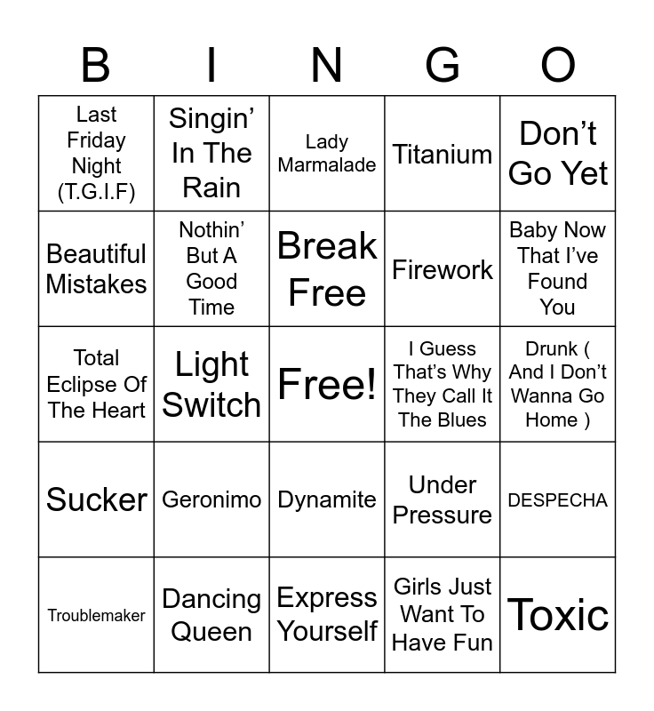 This bingo card has a free space and 65 words: You Make Me Feel So Young, Heroes, Fly Me To The Moon, DESPECHA, Anti-Hero, World’s Smallest Violin, Singin’ In The Rain, Late Night Talking, Break Free, Can’t Stop Us Now, Dynamite, I Gotta Feeling, Drunk ( And I Don’t Wanna Go Home ), Don’t Go Yet, Never Really Over, Beautiful Mistakes, Light Switch, Last Friday Night (T.G.I.F), Enemy, Firework, Geronimo, Sucker, Titanium, Shut Up And Dance, Timber, Roar, My Life, Drive By, Toxic, Shower, Troublemaker, We are Never Ever Getting Back Together, Stayin’ Alive, Don't Stop ‘Til You Get Enough, Under Pressure, Dancing Queen, La Isla Bonita, Total Eclipse Of The Heart, Girls Just Want To Have Fun, The Warrior, Nothin’ But A Good Time, Call Me, I Guess That’s Why They Call It The Blues, Best Of My Love, Tequila, Down By the Lazy River, Baby Now That I’ve Found You, You Can’t Roller Skate In A Buffalo Herd, Waterloo, Material Girl, Stop, I'm Coming Out, … Baby One More Time, Express Yourself, Bye Bye Bye, Haven’t Met You Yet, What A Man Gotta Do, Lady Marmalade, C’est La Vie, Left And Right, Love On Top, Cover Me In Sunshine, Love Song, Remember This and Hold On.