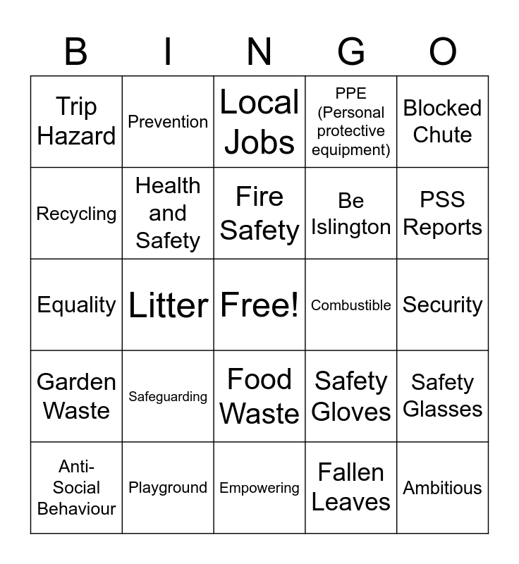 This bingo card has a free space and 49 words: Collaborate, Ambitious, Resourceful, Empowering, Safeguarding, Reporting, Prevention, Caretaker, Recycling, Bin Chamber, Health and Safety, PPE (Personal protective equipment), Safety Glasses, Safety Gloves, Homes and Communities, Eyes and Ears, Fire Safety, Combustible, Clear Hallways, Blocked Chute, Litter, Fallen Leaves, Trip Hazard, Be Islington, We Care, PSS Reports, Anti-Social Behaviour, All Clear, Food Waste, Garden Waste, Garden Beds, Graffiti, Neutraliser, Responsible Dog Owner, Playground, Clean, Safe, Intake Cupboard, Security, Keys, Housekeeping, Welfare, Landlord, Wellbeing, Equality, Local Jobs, Community, Affordable Housing and Inclusive.