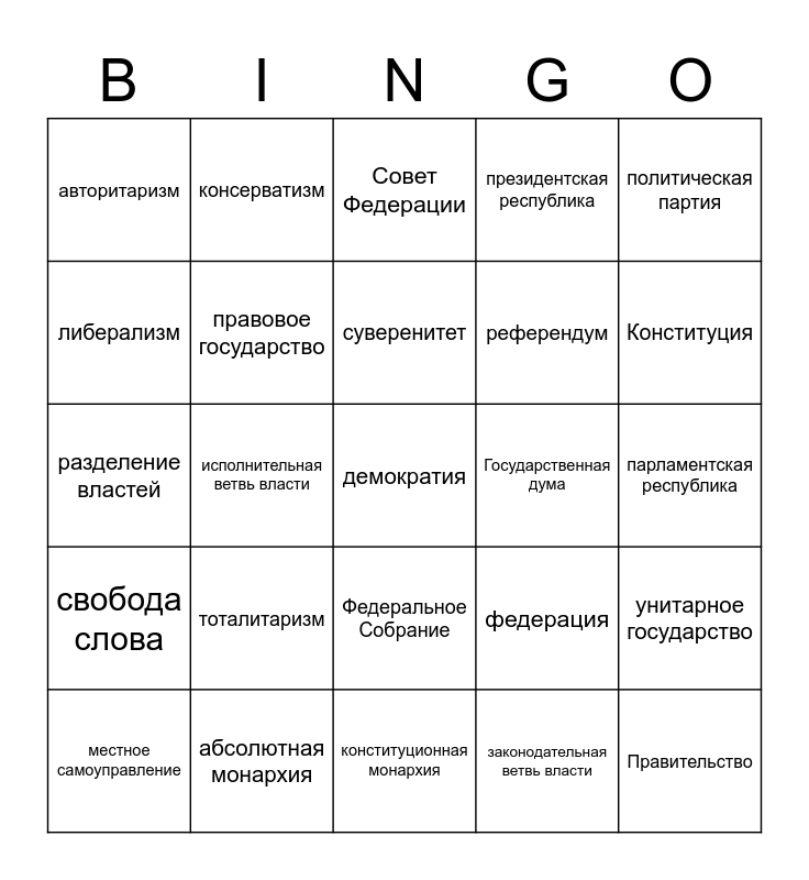 This bingo card has 25 words: тоталитаризм, конституционная монархия, суверенитет, местное самоуправление, политическая партия, авторитаризм, либерализм, консерватизм, Государственная дума, Федеральное Собрание, референдум, разделение властей, федерация, унитарное государство, правовое государство, Правительство, парламентская республика, Совет Федерации, Конституция, исполнительная ветвь власти, демократия, абсолютная монархия, свобода слова, президентская республика and законодательная ветвь власти.