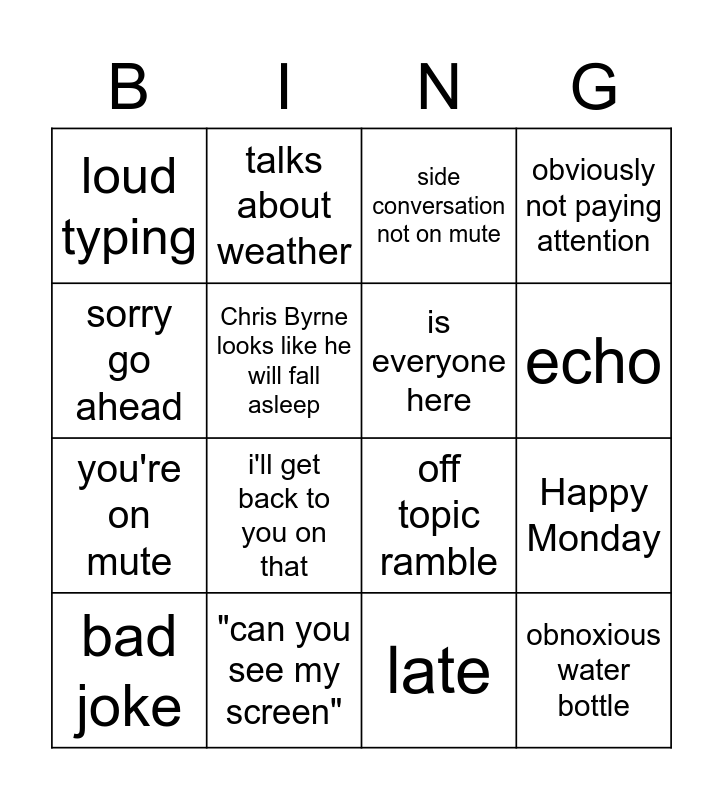 This bingo card has 16 words: "can you see my screen", Happy Monday, side conversation not on mute, loud typing, you're on mute, talks about weather, off topic ramble, late, sorry go ahead, Chris Byrne looks like he will fall asleep, bad joke, obviously not paying attention, i'll get back to you on that, echo, is everyone here and obnoxious water bottle.