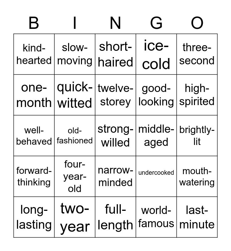 This bingo card has 25 words: four-year-old, full-length, twelve-storey, long-lasting, three-second, kind-hearted, one-month, slow-moving, middle-aged, narrow-minded, good-looking, well-behaved, undercooked, mouth-watering, quick-witted, last-minute, brightly-lit, short-haired, high-spirited, old-fashioned, strong-willed, two-year, forward-thinking, ice-cold and world-famous.