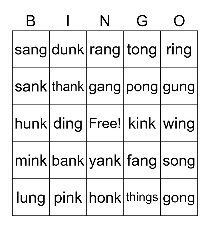 This bingo card has a free space and 24 words: bank, pink, gang, lung, ring, sang, sank, dunk, kink, yank, pong, hunk, fang, song, thank, things, wing, rang, gung, ding, gong, mink, tong and honk.