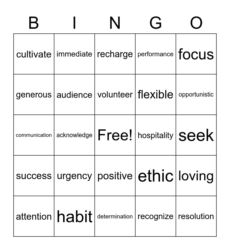 This bingo card has a free space and 75 words: Curious, open mind, recharge, family, represent, engage, recognize, positive, ownership, opportunities, client, improve, volunteer, generous, support, acknowledge, promptly, resolution, solution, focus, group, communication, audience, immediate, performance, discipline, constructive, help, mentor, department,, focus, effort, pride, ethic, opportunistic, flexible, adaptable, change, seek, recognize, diversity, engage, trust, tailor, goals, responsibility, attention, cultivate, understand, appreciation, attention, positive, contribute, generously, share, dialogue, people, benefit, engaged, energy, urgency, safety, patience, kindness, friendliness, hospitality, caring, listening, leadership, loving, success, habit, hark work, determination and happiness.