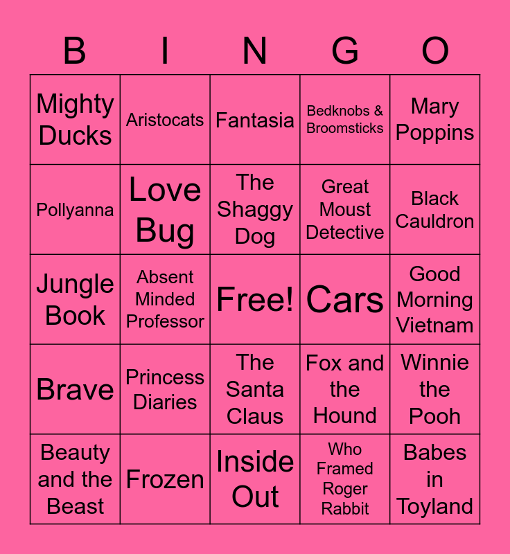 This bingo card has a free space and 75 words: Snow White, Pinocchio, Fantasia, Dumbo, Bambi, Cinderella, Treasure Island, Alice in Wonderland, Peter Pan, Lady and the Tramp, Old Yeller, Sleeping Beauty, The Shaggy Dog, Pollyanna, 101 Dalmatians, Absent Minded Professor, Parent Trap, Babes in Toyland, Sword in the Stone, Mary Poppins, That Darn Cat, Jungle Book, Love Bug, Aristocats, Bedknobs & Broomsticks, Robin Hood, Herbie Rides Again, Escape to Witch Mountain, The Shaggy DA, Freaky Friday, The Rescuers, Pete's Dragon, Cat from Outer Space, Fox and the Hound, Black Cauldron, Great Moust Detective, Adventures in Babysitting, Three Men and a Baby, Good Morning Vietnam, Who Framed Roger Rabbit, Oliver and Company, Dead Poet's Society, Turner and Hooch, Little Mermaid, Pretty Woman, Betsy's Wedding, Beauty and the Beast, Mighty Ducks, Hocus Pocus, Nightmare Before Christmas, Lion King, The Santa Claus, Pocahontas, Toy Story, Hunchback of Notre Dame, Hercules, Mulan, Bug's Life, Dinosaur, Emperor's New Groove, Princess Diaries, Monster's Inc., Lilo & Stitch, Finding Nemo, Pirates of the Caribbean, Cars, Wall-E, Princess and the Frog, Tangled, Winnie the Pooh, Brave, Frozen, Maleficent, Inside Out and Moana.
