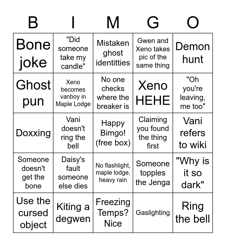 This bingo card has a free space and 37 words: Daisy dies, Vani says "CB" and Xeno says "Where?", Someone closes the door on someone, Xeno becomes vanboy in Maple Lodge, "Why is it so dark", Daisy's fault someone else dies, No one checks where the breaker is, Someone finds the bone, Demon hunt, Master Bate Room, Vani doesn't ring the bell, Gwen and Xeno takes pic of the same thing, Ring the bell, Vani refers to wiki, Ghost pun, Someone doesn't get the bone, Someone plays the piano, Mistaken ghost identitties, No flashlight, maple lodge, heavy rain, Claiming you found the thing first, Bone joke, "Oh you're leaving, me too", Use the cursed object, Freezing Temps? Nice, "Is anyone inside?", Gaslighting, "Did someone take my candle", "Did it change rooms", DID IT BREAK THE TRIPPER, *it didn't actually change rooms*, Gets full asylum on random, Kiting a degwen, Doxxing, tududoot doot doot doo doo, Someone topples the Jenga, Xeno HEHE and Unironic "Can you ready up?".