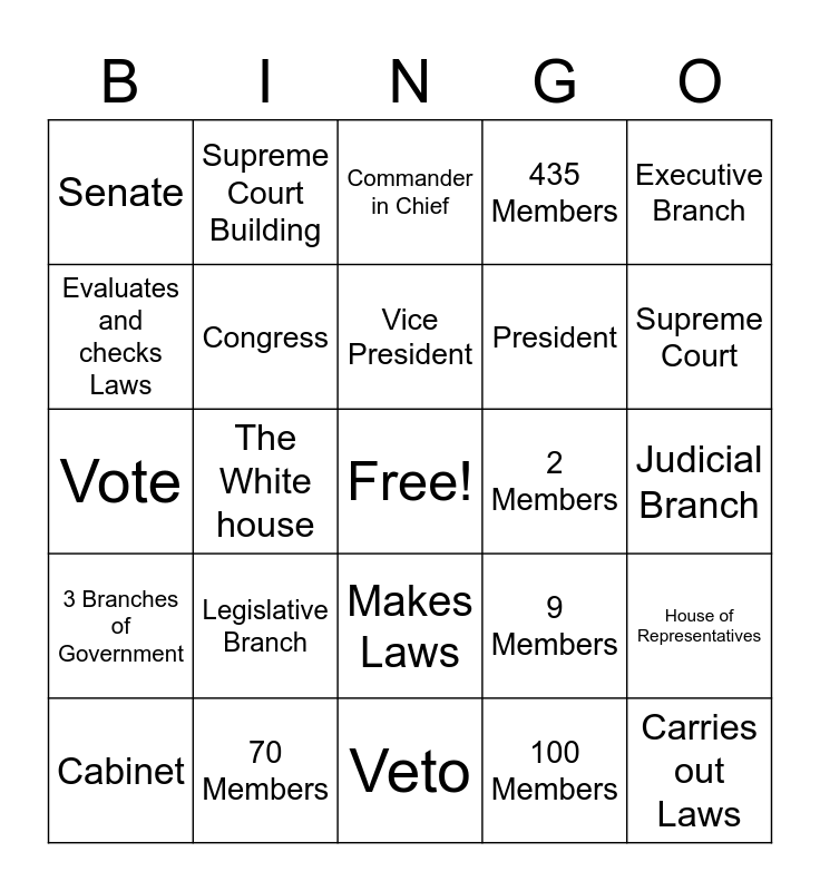 This bingo card has a free space and 24 words: Legislative Branch, 70 Members, Vice President, Cabinet, Executive Branch, Senate, Evaluates and checks Laws, Supreme Court Building, 2 Members, Makes Laws, President, Vote, 9 Members, House of Representatives, Congress, 100 Members, Judicial Branch, Commander in Chief, Supreme Court, The White house, Carries out Laws, 3 Branches of Government, 435 Members and Veto.