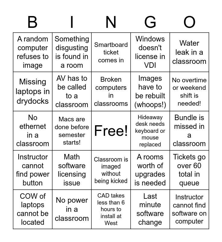 This bingo card has a free space and 24 words: Math software licensing issue, No power in a classroom, Broken computers in classrooms, COW of laptops cannot be located, Water leak in a classroom, A random computer refuses to image, Missing laptops in drydocks, Something disgusting is found in a room, Hideaway desk needs keyboard or mouse replaced, Classroom is imaged without being kicked, Images have to be rebuilt (whoops!), No ethernet in a classroom, A rooms worth of upgrades is needed, Tickets go over 60 total in queue, AV has to be called to a classroom, Last minute software change, Bundle is missed in a classroom, Smartboard ticket comes in, No overtime or weekend shift is needed!, Macs are done before semester starts!, Instructor cannot find software on computer, Instructor cannot find power button, Windows doesn't license in VDI and CAD takes less than 6 hours to install at West.