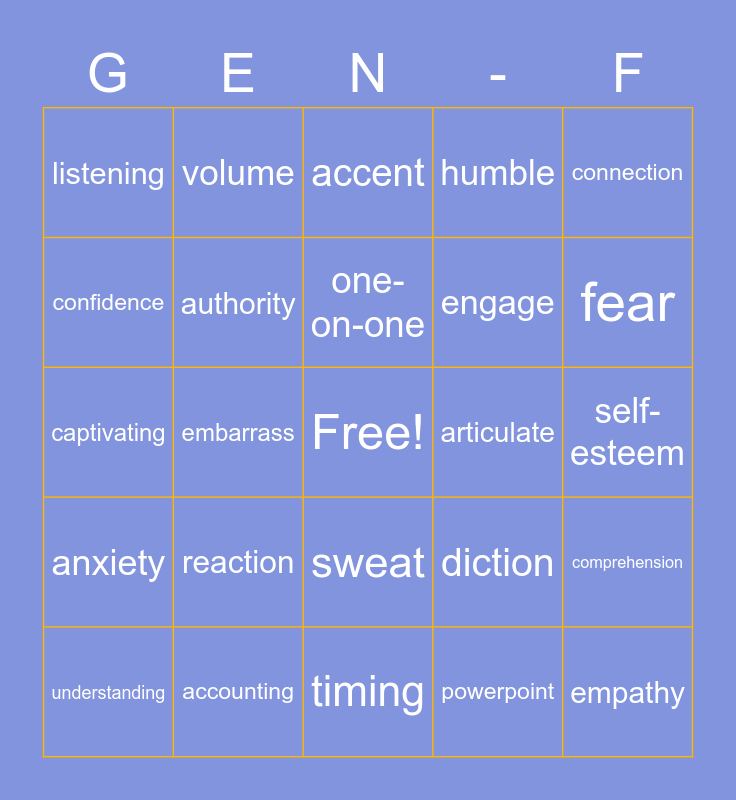 This bingo card has a free space and 60 words: finance, accounting, analysis, anxiety, powerpoint, leader, authority, influence, engage, message, humble, emotion, confidence, eye contact, body language, listening, empathy, connection, audience, one-on-one, articulate, accent, understanding, comprehension, narrative, speech, microphone, humor, fear, characterization, emphasis, imagery, posture, phrasing, volume, storytelling, nervous, embarrass, rhetoric, captivating, attention, reaction, self-esteem, meeting, diction, eloquent, visualize, verbalize, face-to-face, sweat, timing, career, management, leadership, coworker, collaboration, passion, ideas, presence and glossophobia.