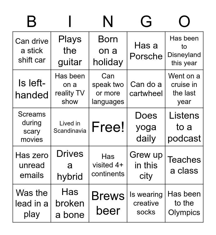 This bingo card has a free space and 24 words: Drives a hybrid, Has broken a bone, Can speak two or more languages, Was the lead in a play, Has been to Disneyland this year, Can drive a stick shift car, Is left-handed, Plays the guitar, Does yoga daily, Has visited 4+ continents, Can do a cartwheel, Screams during scary movies, Grew up in this city, Teaches a class, Has been on a reality TV show, Is wearing creative socks, Listens to a podcast, Born on a holiday, Went on a cruise in the last year, Lived in Scandinavia, Has been to the Olympics, Has zero unread emails, Has a Porsche and Brews beer.
